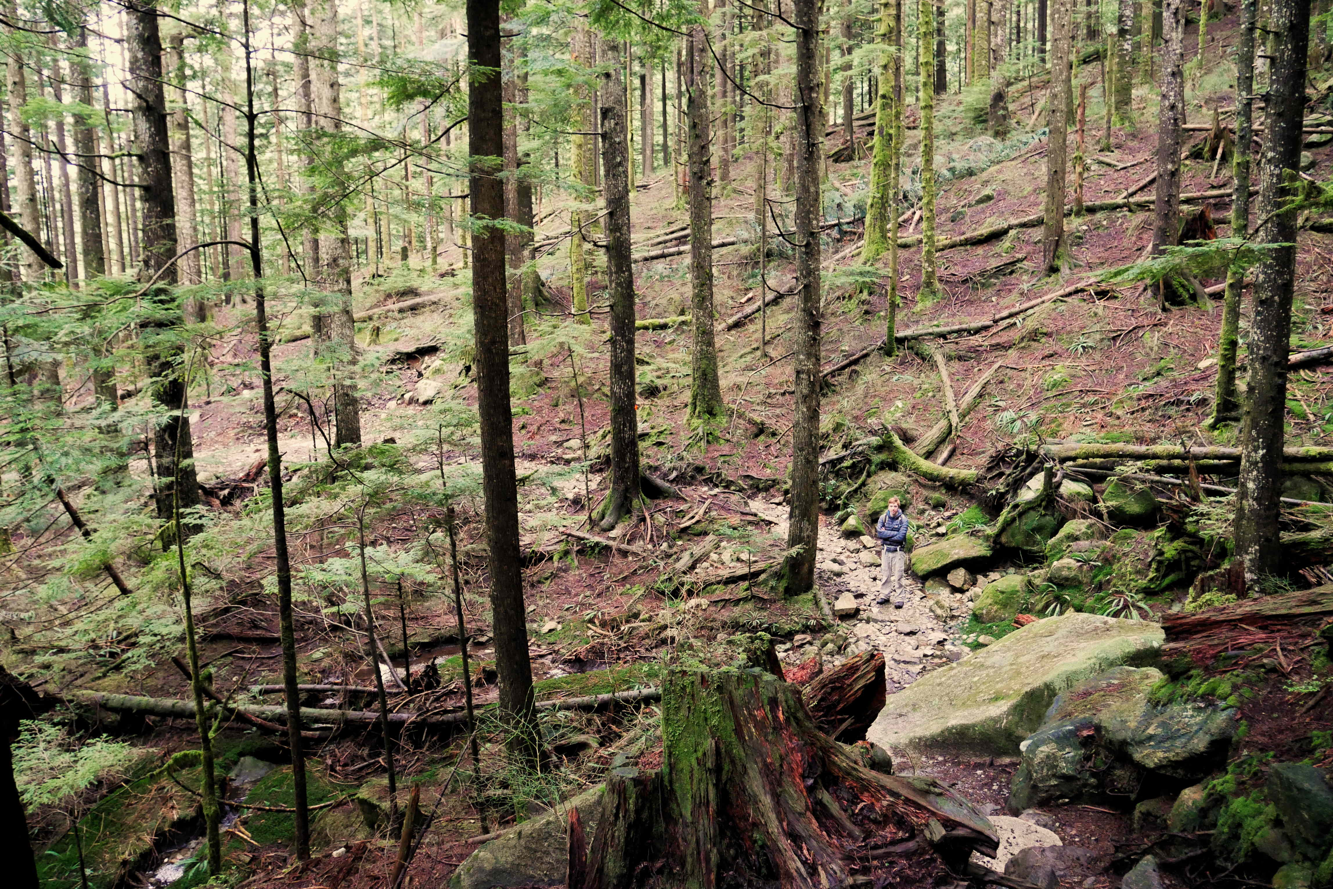 The trail was relatively quiet compared to most around Vancouver and had a good mixture of up, down, flat, mud, rocks and roots to keep Ollie entertained. Rosie was entertained by the latest outdoor craze – mushroom hunting. There were several fun bridges to cross and we managed to go back on a slightly different route to the way out – which pleased the hiking gods.