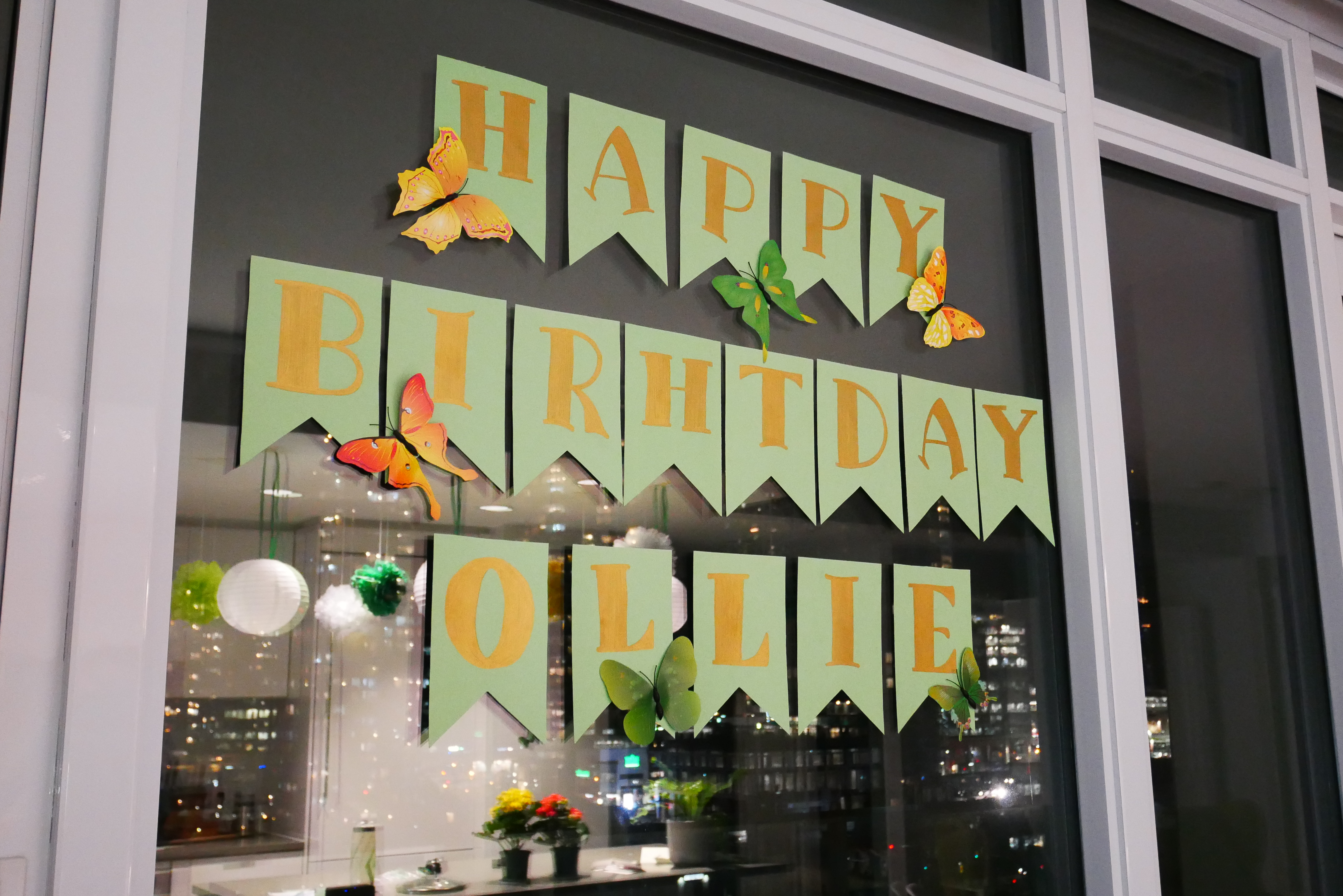 Last Monday, Ollie woke up to find Rosie had snuck out of bed. He went back to sleep and found her next to him asleep later. When confronted, she claimed she had simply been for a night time bathroom trip. But, when Ollie got out of bed and walked into the living room, he was met by lots of decorations and a poorly spelt banner.