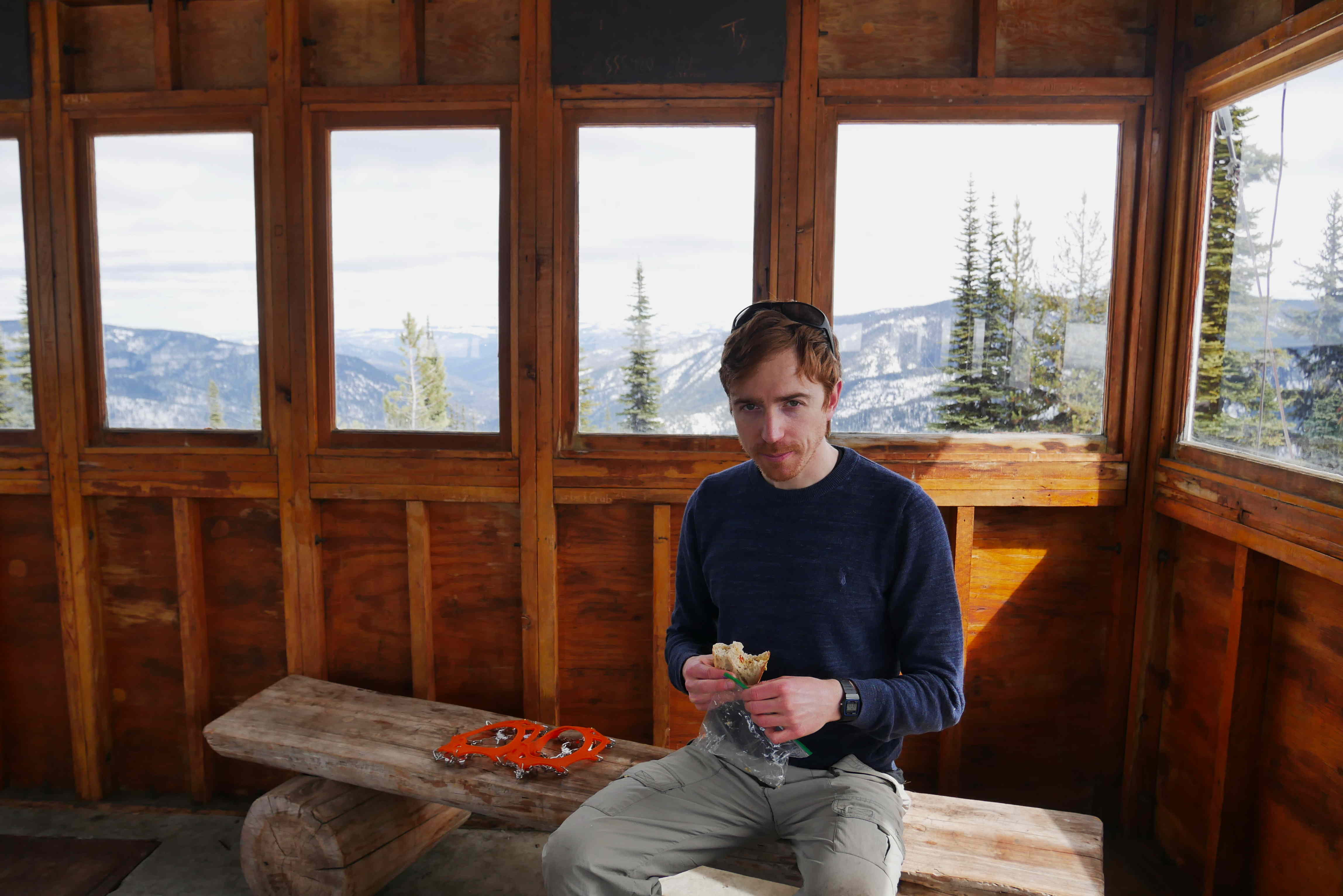 Anyway… the path was mostly compacted, it was easy enough to walk up with the microspikes on. However, on the way down, heavy footed Rosie kept falling into the snow up to her knee with one leg (known as post-holing), so she was grateful to have the snowshoes! At the top there is an old tower which used to be used to spot forest fires. These days they have aeroplanes for that, so the tower is mostly used for eating houmous sandwiches in.