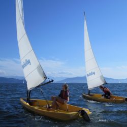 The weather has been consistently hot this week, but not consistently windy. On Tuesday we followed our instructors quite a long way out into the Burrard Inlet, where the wind promptly vanished. Ollie immediately got cabin fever, but Rosie was happy singing sea shanties and looking for seals. Eventually our instructors towed us all back to port with their motor boats – how embarrassing.