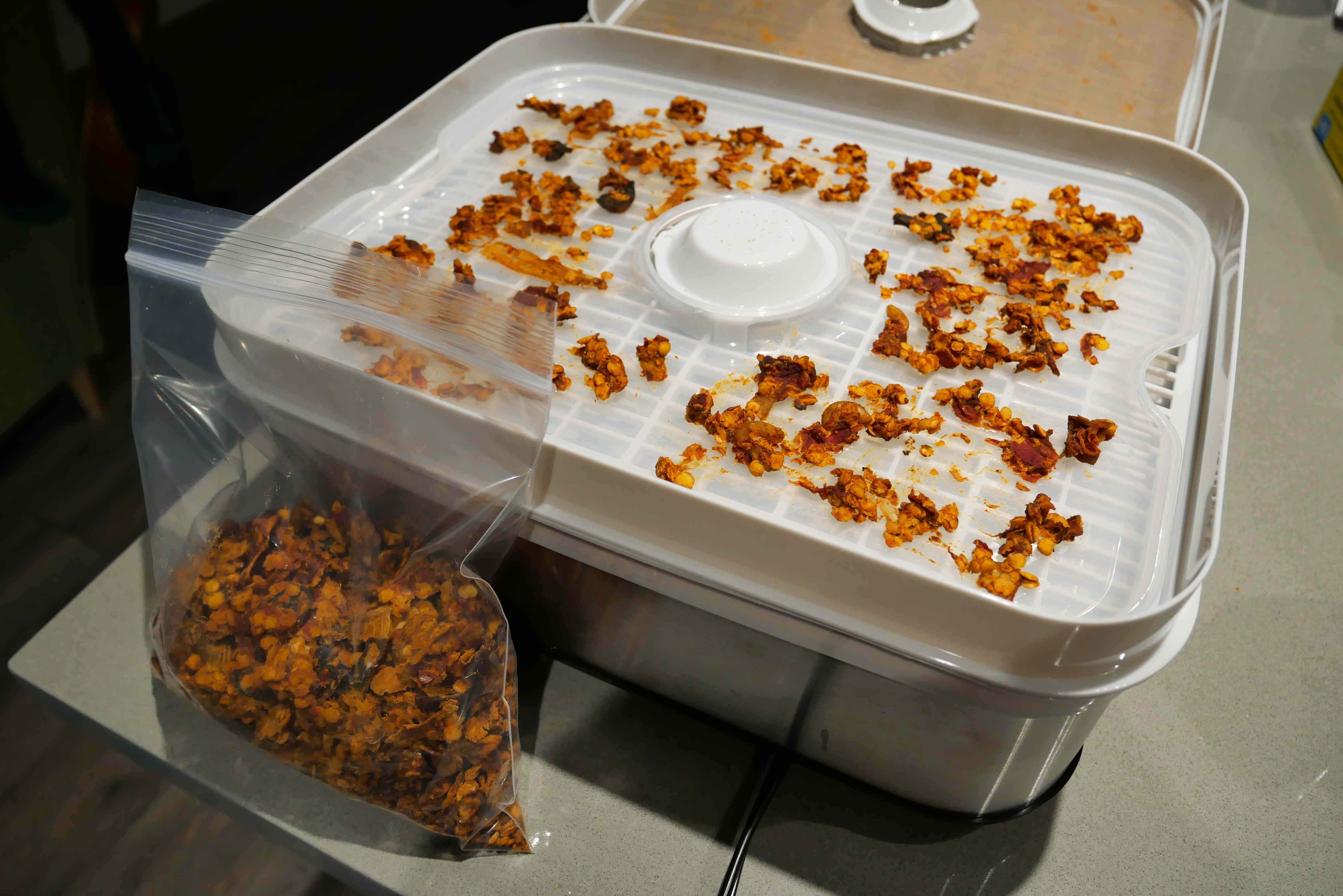 - Just add water curry, made from dried veg, dried tofu, spices and shop-bought dried peanut butter and coconut milk (can’t make those in the dehydrator because of the fat content)