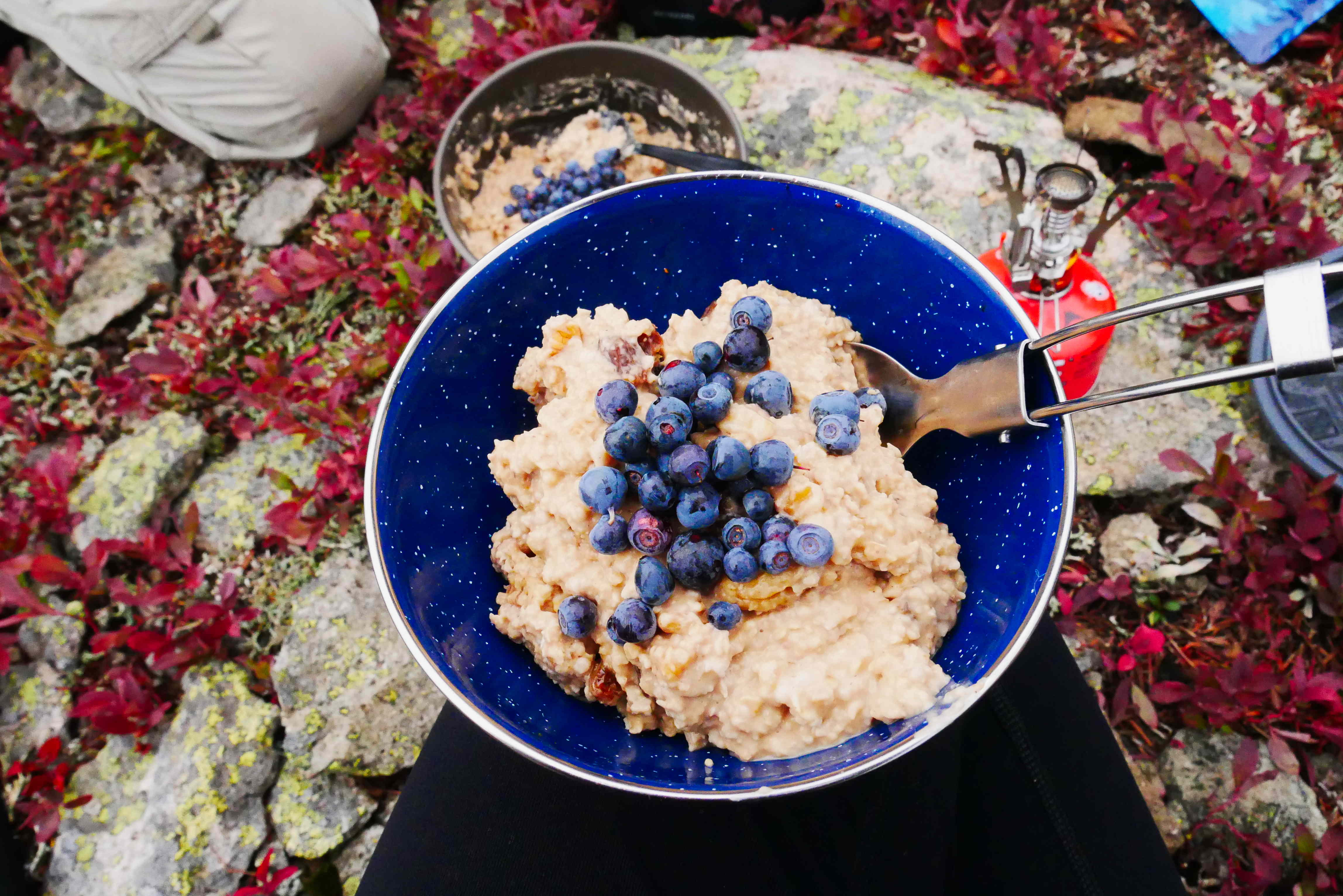 It was extremely windy overnight! The trees protected our tents perfectly, and we enjoyed the strangely soothing howling winds. Monday morning was still cloud covered, but they blew away as the day progressed. The whole area is covered in pink wild blueberry plants, so our usual porridge was extra special!