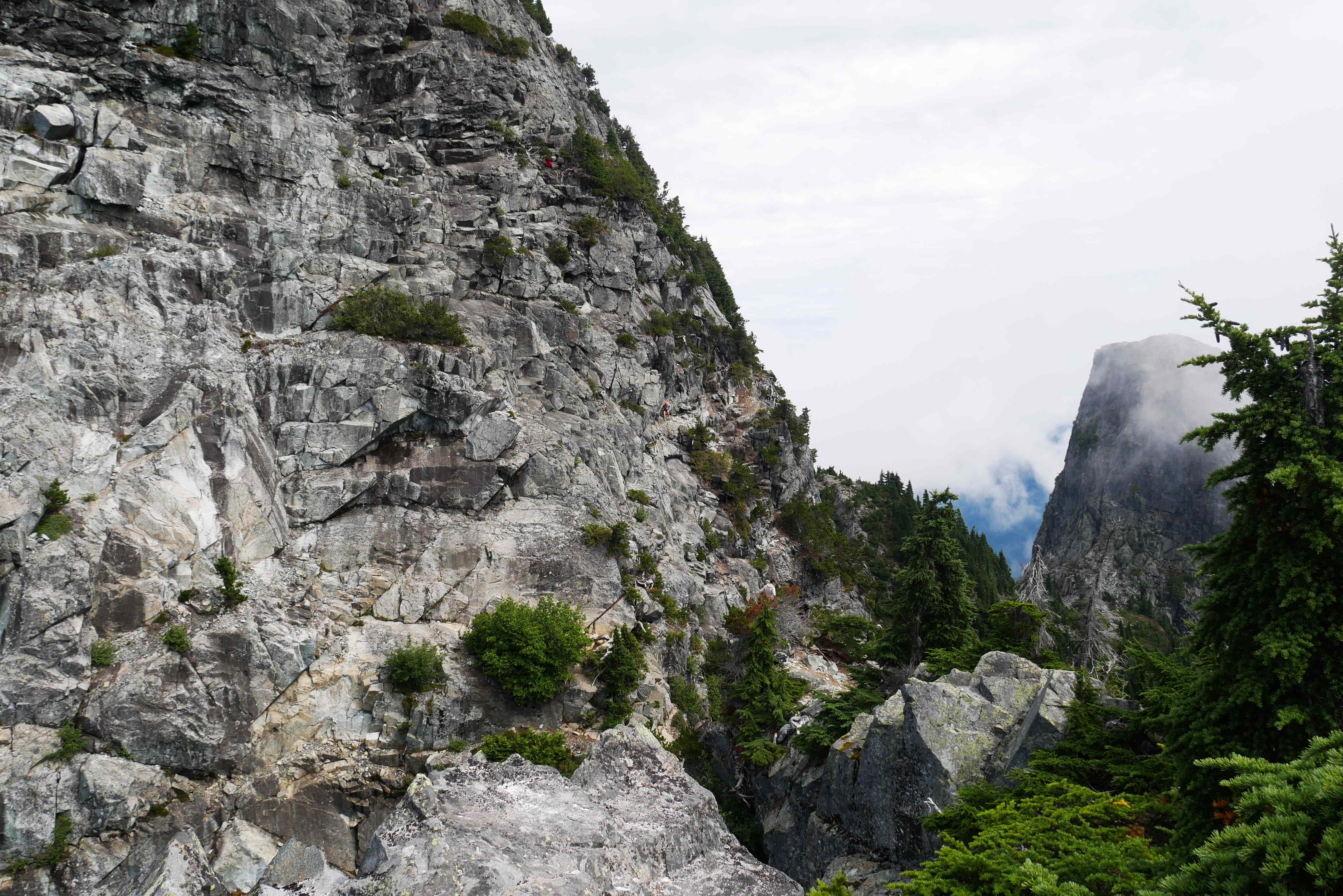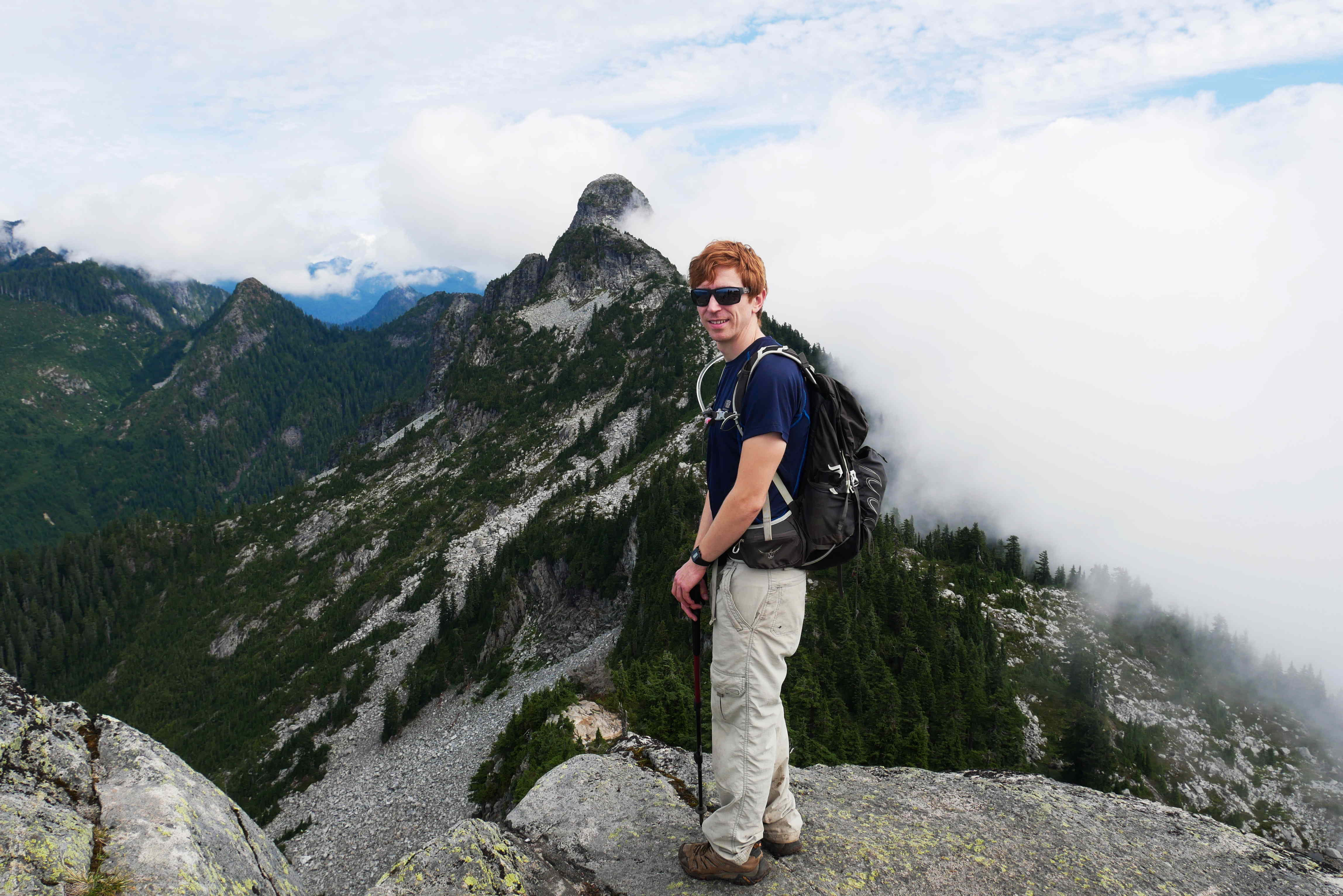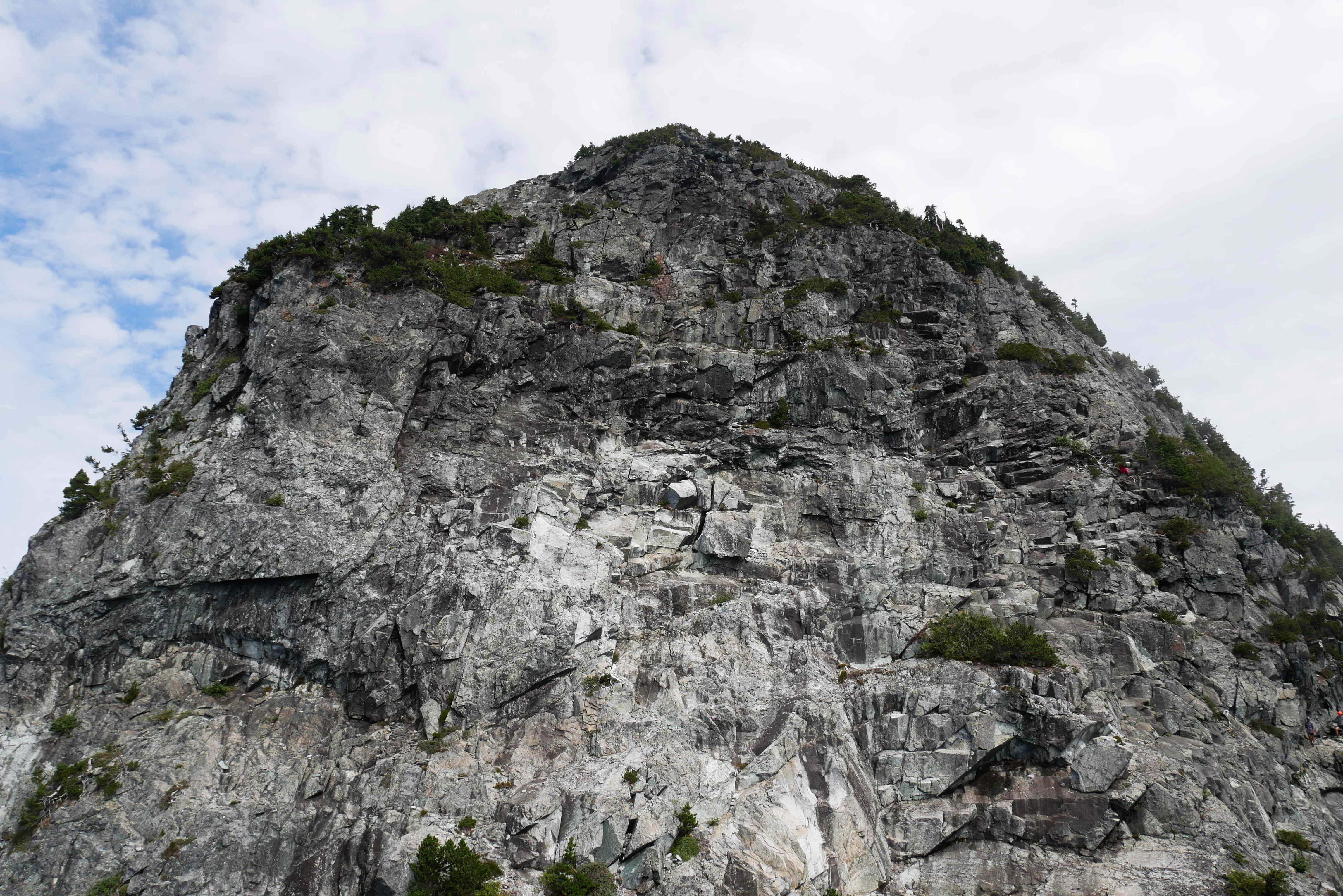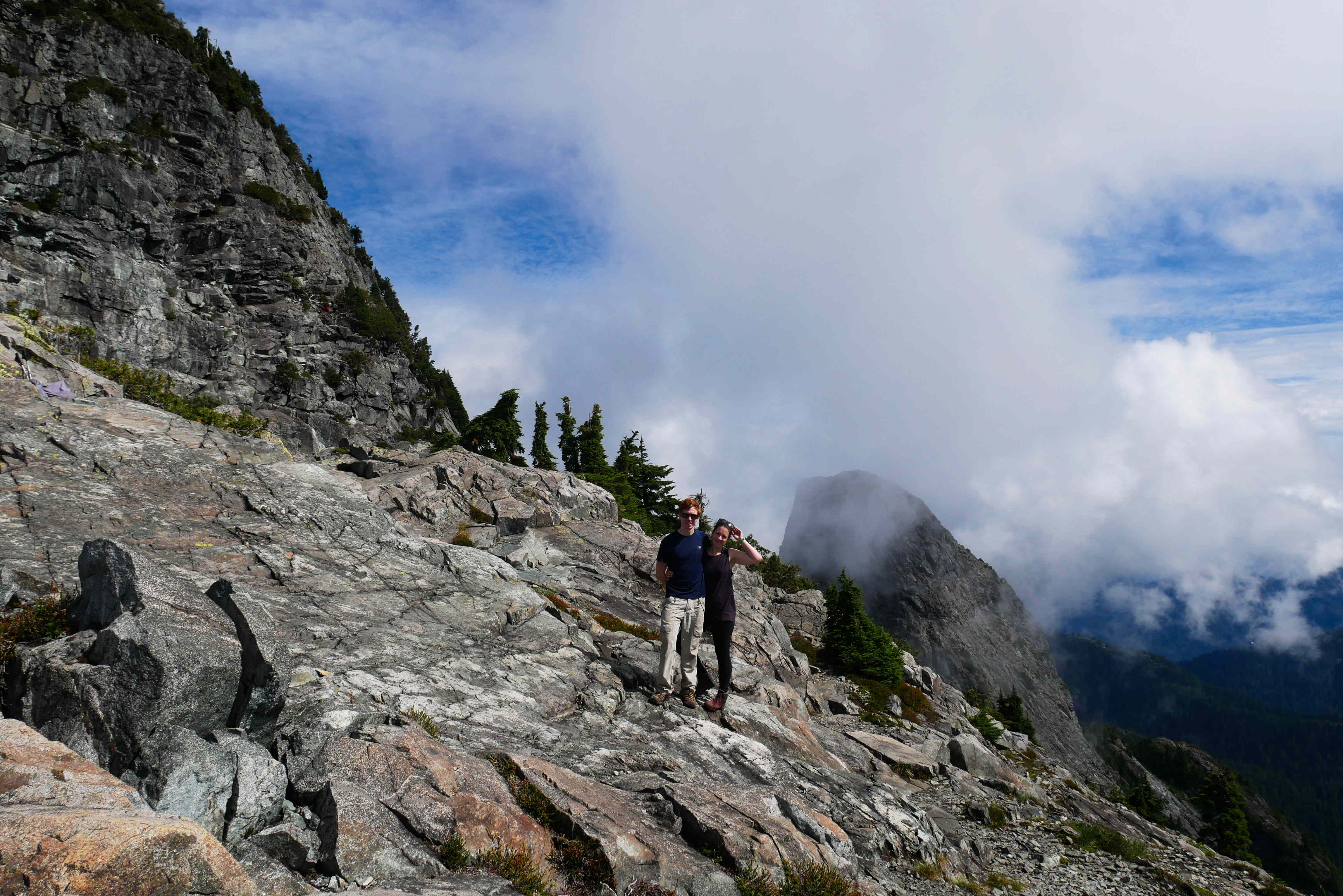 Eventually, after a very long slog, we emerged out onto the enormous granite slabs of Coliseum Mountain. There were lots of clouds in the sky, but we could make out some views in between them.